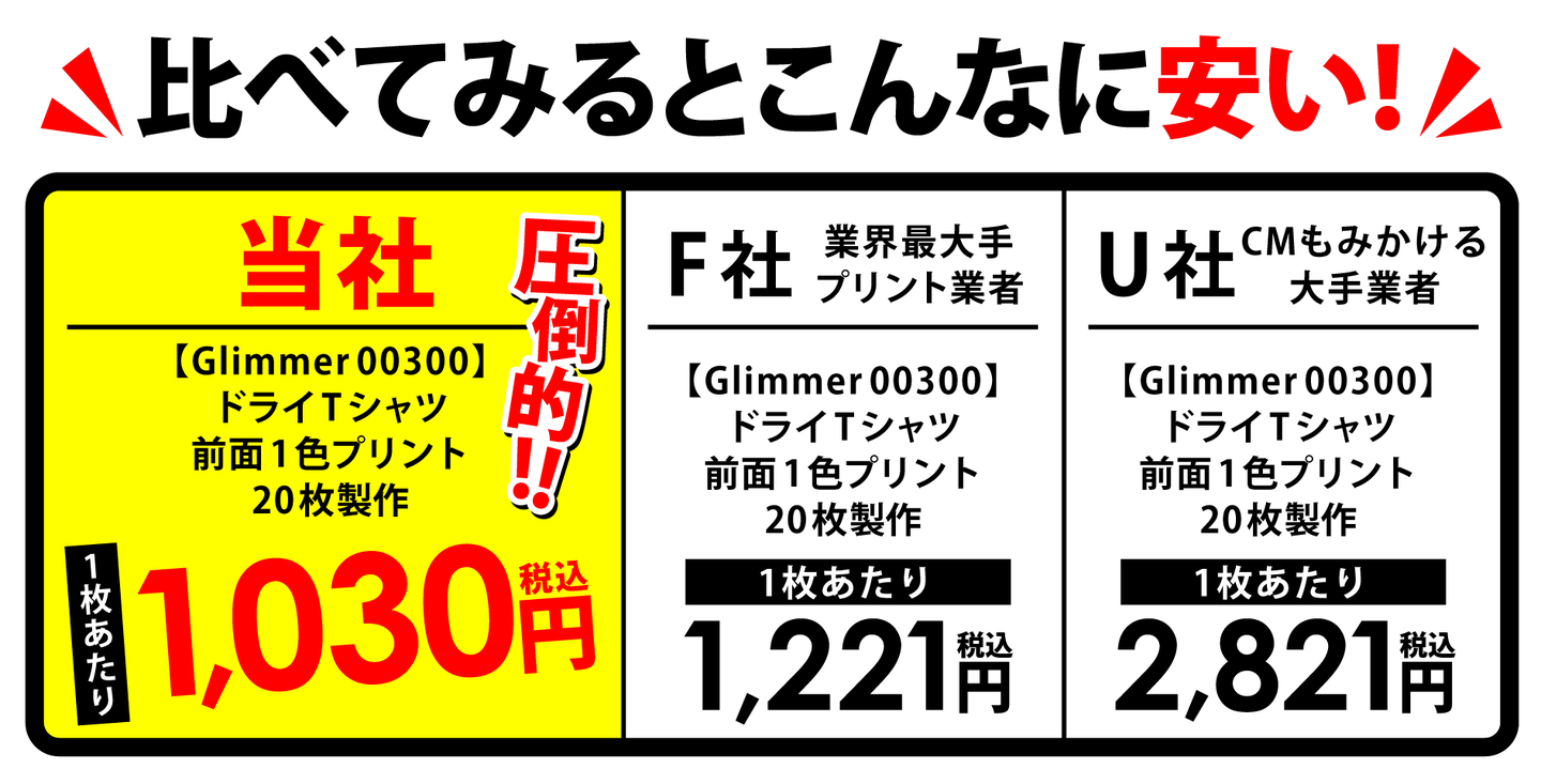 プリンタブルマーケットで作るオリジナルTシャツの料金は、業界大手の業者と比べてもかなり安い料金です。「大手だから高くても安心」「あまり安すぎるのも不安」と感じる方もいらっしゃるかと思います。ですが、私達は大手では無いからこそ、1件1件のご注文に丁寧に対応でき、コストダウンをはかれ、お客様に提供する料金を下げていける、と思っています。